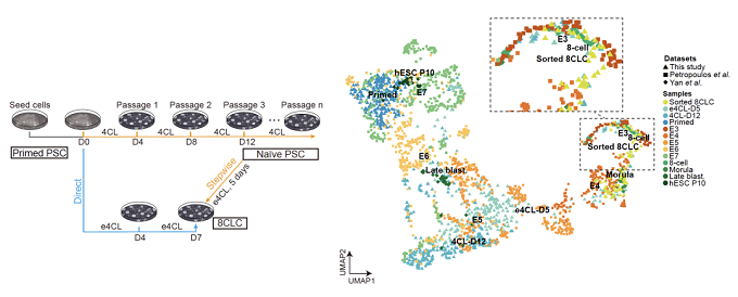 中國(guó)科學(xué)院廣州生物醫(yī)藥與健康研究院Miguel A. Esteban研究組開發(fā)了一種非轉(zhuǎn)基因、快速且可控的重編程方法,將人多能干細(xì)胞(PSC)誘導(dǎo)為全能性的8細(xì)胞期胚胎樣細(xì)胞(8CLC)。