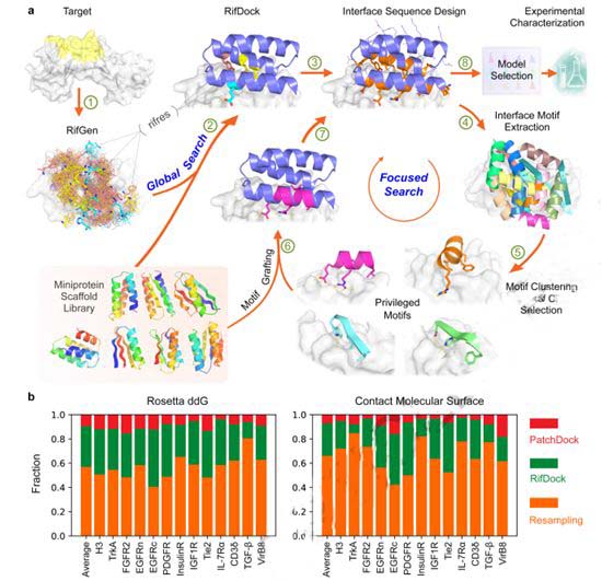 這些結合了計算蛋白設計領域的最新進展,開發出一種產生新蛋白的策略,這些新蛋白以類似于抗體的方式結合它們的分子靶標。他們開發的軟件可以掃描靶分子,識別潛在的結合位點,產生靶向這些位點的蛋白,然后從數以百萬計的候選結合蛋白中進行篩選,以確定那些最可能發揮作用的蛋白。