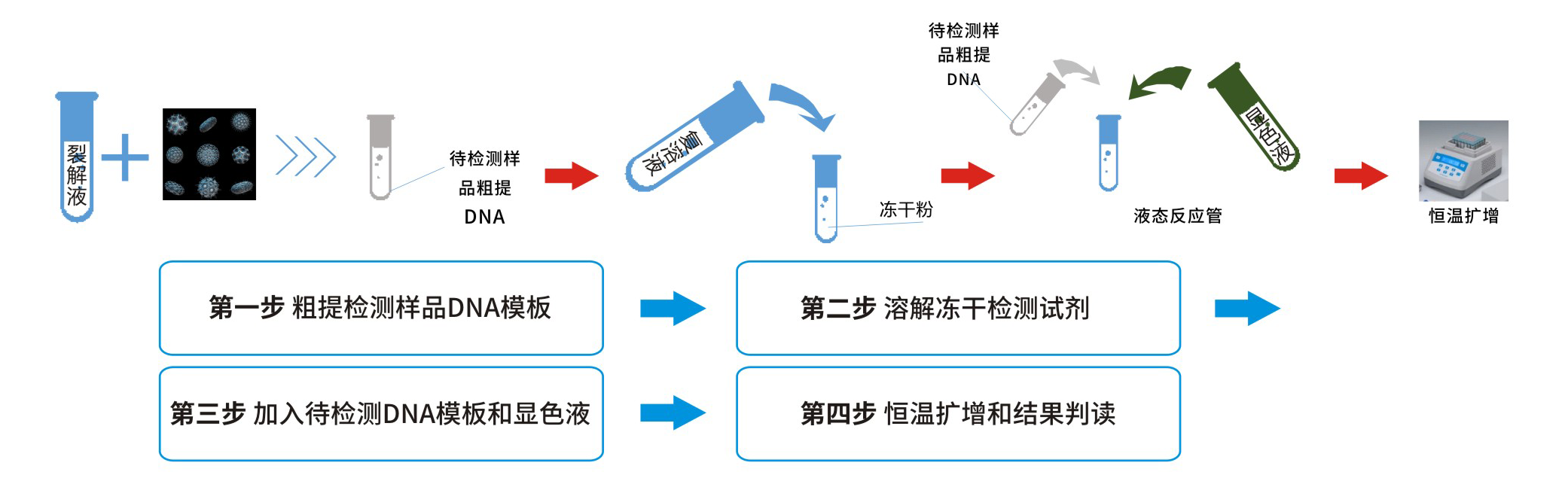 1. 技術(shù)原理:利用兩對(duì)特殊引物和具有鏈置換活性的BstDNA聚合酶,使模板兩端引物結(jié)合處循環(huán)出現(xiàn)環(huán)狀單鏈結(jié)構(gòu),引物順利與模板結(jié)合并進(jìn)行鏈置換擴(kuò)增反應(yīng),實(shí)現(xiàn)在恒溫條件下(60~65℃)進(jìn)行連續(xù)快速擴(kuò)增。反應(yīng)加入顯色指示劑,陰陽(yáng)性結(jié)果顯色差異顯著,可直接通過(guò)顏色變化判讀結(jié)果。
