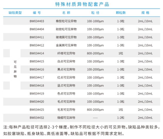 備注:藥企新增的產品線/生產線難以收集真實的陽性樣品,需要定制特殊材質的可見異物標準物質,如玻璃屑、金屬屑等,模擬實際生產中可能引入的外來異物。常用的產品如下表所示:
