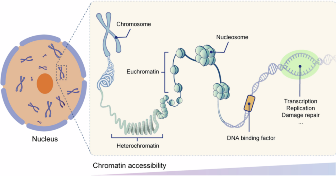 染色質可及性,也稱染色質開放性,它描述了染色質的物理壓縮程度,決定了轉錄因子等調控元件能否與DNA結合,從而直接關系到基因是否能夠被“打開”進行表達。簡單來說,染色質可及性就像是基因的“開關閥門”,開放區域意味著基因有被激活的潛力,而封閉區域則意味著基因沉默。
