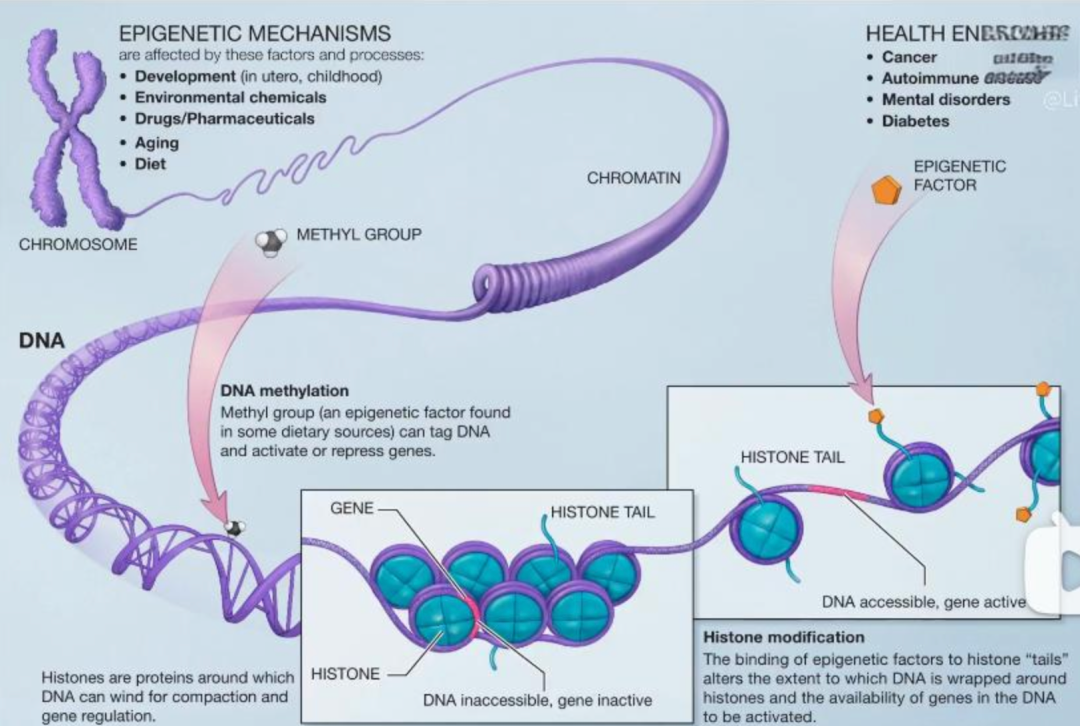 比如,同卵雙胞胎起源于同一個受精卵,擁有100%相同的遺傳物質,隨著年齡增長,尤其是當他們生活在不同的環境(不同的飲食、壓力、毒素暴露、生活習慣)中時,他們體內的表觀遺傳修飾會逐漸產生差異。從現在的一些已知研究結果來講,環境因素可能改變了他們身體細胞內的DNA甲基化模式和組蛋白修飾。